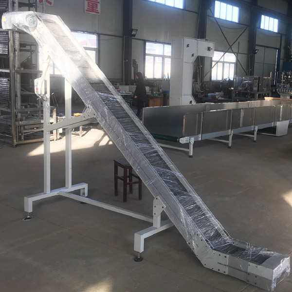 爬坡鏈板輸送機采用特制的推板,使得物料在向上或向下輸送時,不會沿鏈板下滑。適用于大傾角輸送物料。如空間及物品形狀允許,可代替連續(xù)提升機使用。它是在鏈式輸送機的兩側(cè)鏈條間加裝板式構(gòu)件,以達到輸送型態(tài)不規(guī)則的物品,在鏈板上加裝專用工裝夾具,并根據(jù)工控要求可作為裝配線,或直接采用塑鋼平頂鏈或不銹鋼平頂鏈作為輸送載體。