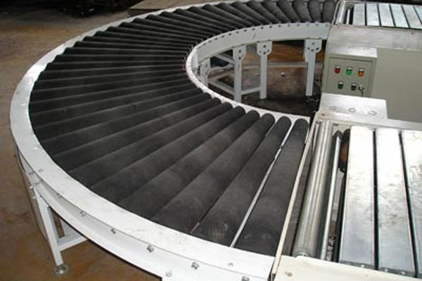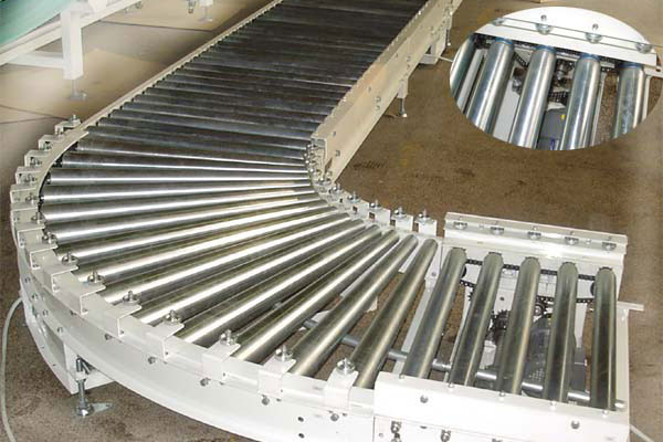A.直輥轉(zhuǎn)彎?rùn)C(jī):由于輥筒內(nèi)外側(cè)直徑不變,轉(zhuǎn)彎角速度不同,相同時(shí)間內(nèi)轉(zhuǎn)過(guò)的弧長(zhǎng)不同,物件在轉(zhuǎn)彎的同時(shí)還發(fā)生自轉(zhuǎn),所以輸送物在轉(zhuǎn)彎時(shí)靠外側(cè)護(hù)欄、護(hù)輪、導(dǎo)軌的輔助進(jìn)行輸送。直輥轉(zhuǎn)彎?rùn)C(jī)只適用于回轉(zhuǎn)體或無(wú)角度要求的物件輸送,物料轉(zhuǎn)出時(shí)會(huì)改變輸送方向。