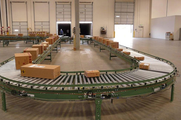 B.錐輥轉(zhuǎn)彎?rùn)C(jī):錐輥轉(zhuǎn)彎?rùn)C(jī)是通過(guò)錐形輥筒旋轉(zhuǎn)時(shí)表面各點(diǎn)速度的不同來(lái)實(shí)現(xiàn)轉(zhuǎn)彎的。內(nèi)外圈的轉(zhuǎn)彎角速度相同。在輸送的同時(shí)能保證物件隨轉(zhuǎn)彎角度的變化同步轉(zhuǎn)動(dòng),所以無(wú)需側(cè)滑軌。物料轉(zhuǎn)出時(shí)輸送方向不改變。