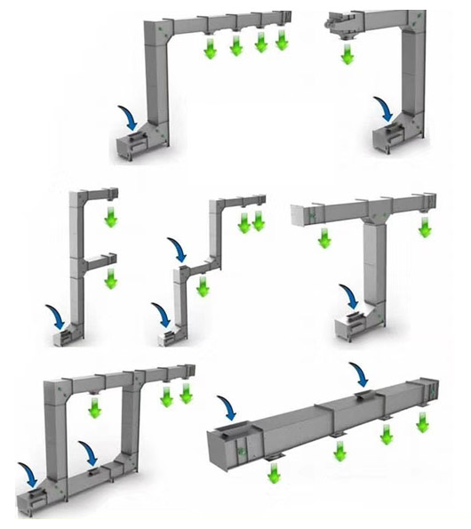 轉斗式提升機又稱為斗提機,鏈斗式提升機,由機頭、機尾及豎直段機筒、傳動軸、鏈輪、鏈條、料斗、馬達、電控幾部分組成,料斗與料斗之間采用無縫搭接形式,可滿足顆粒、粉末、短條狀、小塊狀物料的連續(xù)式垂直提升輸送,進出料口位于設備的兩側或同一側,可滿足同一平面的多點進料,亦可不同層進出料,一層既可以提升到二層,同時也可以提升到第三層,使得進料口及出料口不在同一平面的多點出料問題得到解決;料斗采用了PP塑料材質,可直接與食品接觸;提升物料與料斗之間相對靜止,使得物料在提升輸送過程中不會產生破損,對破損率要求嚴格的種子、有機大米、堅果等物料來說,斗式提升機為較好的選擇;提升高度達到了40米,提升量≤20立方;我們通過加大了料斗的容積,使得整個設備運轉的速度始終處于低速運轉狀態(tài),間接的延長了提升料斗以及鏈條的使用壽命,減少了易損件的損耗,相比較老款斗式提升機來說降低了設備的維護成本,提升了產量,降低了能耗;